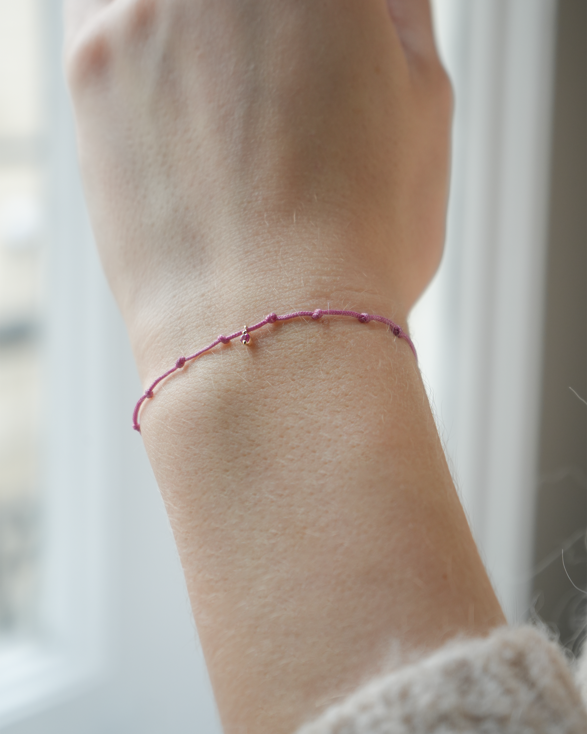 Dieses bezaubernde Birthstone Armband kombiniert minimalistisches Design mit hochwertiger Eleganz. Gefertigt aus einem kräftigen, roten Textilband, wird das Armband durch acht dekorative Knoten verziert, die ihm eine einzigartige Struktur und Symbolik verleihen.