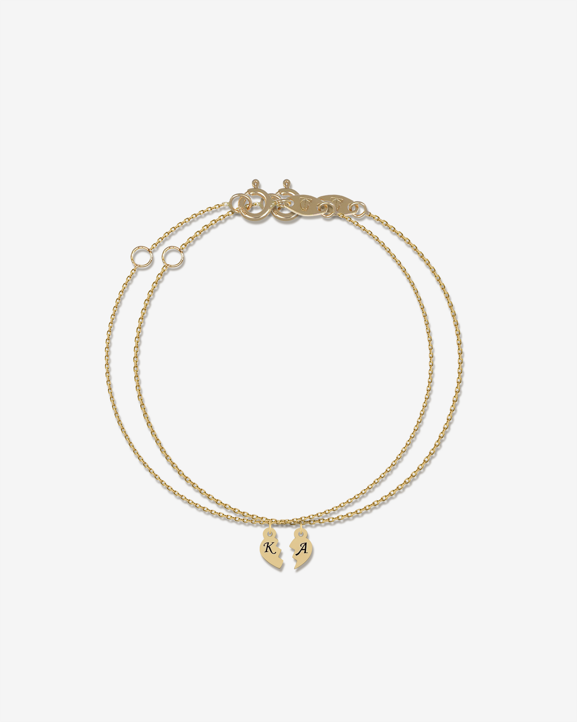 Im Mittelpunkt stehen zwei Herzhälften, die nur zusammen ein Ganzes ergeben. Jede Hälfte trägt eure Initialen und erinnert euch daran, was euch verbindet.